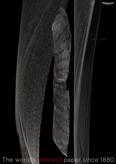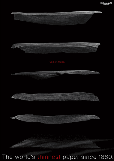 “Veil of Japan”映像では、漆黒の空間の中、まるで和紙を梳いた時のように水から現れ、その軽さゆえに浮遊し、美しく風に舞う姿を撮影。美しい光と影がおりなすビジュアルで、世界一薄い「土佐典具帖紙」に宿る、唯一無二の存在感を表現しました。