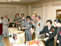 代表取締役会長)、大阪府、大阪市、早川良雄様、方々の祝辞を頂き、関西の酒蔵、白鶴、大関、月桂冠、松竹梅より祝儀の鏡割りを行い、服部理事長の乾杯音頭で華やかな祝宴が催された。中締めでは、森副代表幹事と本田幹事の絶妙なやり取りで、“WA”の一本締めで大いに会場が和み、久しぶりに大阪にこのような会が出来、楽しみにして、期待している、との声を聞き、お開きとなりました。 |