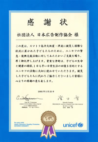 集まりました募金は目録にて、平成17年5月25日に寄付会員社リストを添え、当協会名にて、服部理事長より、(財)日本ユニセフ協会/東郷専務理事へ寄付(5月31日銀行振り込み)を行いました。