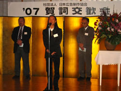 服部理事長が壇上に立ち年頭挨拶で「第1に、2008年3月に開催する第2回クリボラ展成功のために、会員各社の作品出展とクリボラ財政PJ委員会の行っている募金活動に協力してもらいたい。第2に、今年は特にインターネット広告について経営面及びクリエイティブ面から取り組みたい。第3に、今月末に役員改選の選挙公示がされる、OACの活性化のために是非多くの会員が立候補あるいは推薦を行ってもらいたい」と熱く語り、高らかに乾杯の発声をしました。