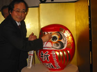 宴たけなわの頃、司会者の渡辺氏本人が務めるクリボラ財政PJ委員会委員長が「クリボラ展2008」のキックオフを宣言。壇上には2008年クリボラ展の成功を祈願する大きなダルマと神田明神で護摩を受けた御札が並べられ、一堂拍手の中、服部理事長がダルマの片目に黒々と墨を入れる。その後、BGMの流れと共に会場に設置されたスクリーンには2006年各地で開催されたクリボラ展の模様が映し出され注目を浴びた。そうした最中に壇上ではクリボラ実行委員会の幹部が紹介され、同時にクリボラ財政PJ委員会のメンバーが募金箱を下げて会場を周り、多くの皆様からクリボラ基金となる寄付金73,000円が寄せられ、開催スタート年として大いに盛り上がるイベントとなりました。