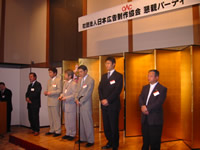 来賓挨拶と乾杯は、昨年に引き続き社団法人 日本広告主協会専務理事であります小林 昭氏から頂きました。同氏は挨拶で、クリボラ展の後援団体として本展の社会的意義を賞賛し、成功裡に閉会したことを祝しました。また、同協会のクリエイティブ委員会は3年目を迎え、広告主としてクリエイティブを正しく評価する眼と心を養うことに務めている、そしてOACと手を携えて広告の世界を夢のある楽しいものにしたいと抱負を語り、杯を高らかに掲げて乾杯の発声をしました。