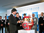 セレモニーは假屋崎省吾氏の華麗な生け花のインスタレーションをプロローグに、鈴木清文OAC常務理事の開会挨拶でスタート。「(財)日本ユニセフ協会」の中井裕真広報室長の挨拶に続いて、受賞作品の除幕式、プレゼンテーター山田邦子さんによる授賞式がとりおこなわれ、「国際連合広報センター」幸田シャーミン所長の総評で締めくくられた。続いてレセプションでは山本昌邦OAC常務理事の開会挨拶ののち、大畠邦彦「JAAA」専務理事、梶祐輔「OAC顧問」らの多彩なスピーチとダルマの目入れなどで、会場は大いに盛り上がり、渡辺紘崇OAC理事の閉会の辞で滞りなく終了した。