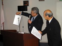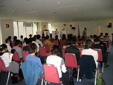 冒頭、山本常務理事によるクリボラの意義説明と参加の呼びかけを皮切りに、国連児童基金(ユニセフ)東京事務所代表のダン・ローマン氏の挨拶、日本デザインセンター代表取締役鈴木清文氏による「OACクリボラ世界巡回ポスター展2007・ジャカルタ」の現地報告などが行われた。