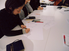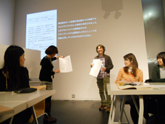その後グループごとに別れ、より実践的な試みへ。仮想企業のプレスリリース&コンセプトシートをもとに、ワンキャッチ、ワンビジュアルのチラシを企画し、プレゼンするという内容です。「本当にメッセージすべきこと」を絞り込む事の難しさを学べる有意義なワークショップになりました。