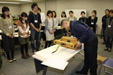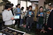 2010年度第8回「製本」が、2月25日文京区シビックセンターと講師役である常川製本さんの工場におじゃまして開催されました。 今回は「体験型」と銘打って、参加された方に上製本を実際に作っていただきました。講師の常川製本牧野取締役から、開口一番「これから皆さんに上製本を作っていただきます」と告げられたときには、参加された方はびっくりしたかもしれませんが、先に手作業での制作を体験したことで製本の工程や設計(デザイン)する時の押さえどころがより良く理解できたのではないかと思います。 「束」や「表紙」など、いくつかのパーツはあらかじめ用意していただき、上製本特有の組立て工程を、細かく指導を受けながら進めてゆきました。結構微妙な加減をしなければならないところもありましたが、的確な指導のもと全員みごとに上製本を完成することが出来ました。本物の製本の仕事が流れている中、お手伝いいただいた常川製本のみなさん、ご指導いただいた東京都製本工業組合のみなさん、ありがとうございました。