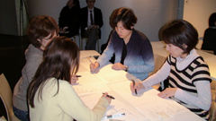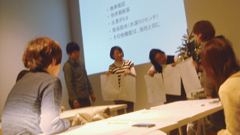 第一部は佐藤講師による門外不出の「ビジュアル インキュベーション」 テクニックを特別講義で、クリエイティブシンキングのポイントを分かりやすく伝授していただきました。その後、講義中に紹介された発想法の中から「曼荼羅チャート法」を例に課題が出され、グループごとに分かれた参加者が、“携帯電話”をテーマにしたビジュアル発想に取り組みました。出されたアイデアは若者らしく愉快なものや、とばした発想が多く、講師の佐藤さんを中心に活発な意見交換がなされました。
