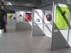 東北電子専門学校の1階エントランスホール全体にグラフィックデザイン全作品を展示。