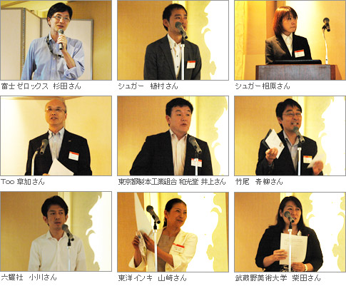 その後、現賛助会員社である富士ゼロックス(株)、(株)シュガー、(株TOOさんより特別プレゼンテーションをいただきました。また、会場に資料を添えられた、東京都製本工業組合、(株)竹尾、(株)六耀社、(株)東洋インキ、武蔵野美術大学(株)さんから30秒PRをお願いいたしました。