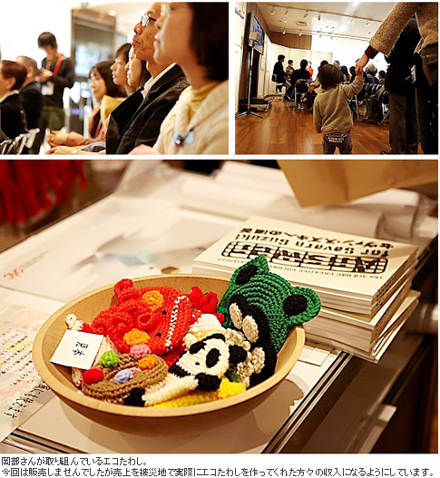11月3日はトークショーを開催。今回のカレンダー企画の立役者ともいうべき花巻在住のイラストレーターでいち早く被災地でのボランティア活動に乗り出し現在も継続的に活動を行っている岡部慶子さん。この方が、被災地で聞いた生の声「頑張れ!は良いけど、実際に頑張っている。そうじゃなくて少しでも心が和むような何か欲しい」。その声を元に今回のカレンダー企画は立ちあがりました。