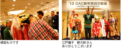 歓談に入ってまもなく、江戸囃子/鼓太郎社中によるお囃子と獅子舞が披露されました。獅子は大きな口を開けてご祝儀を呑みこみ、所狭しと会場内を立ち振る舞っていました。
