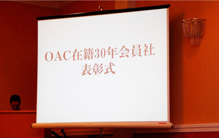定例総会に引続き、OACに30年以上在籍されている会員社の皆さまを表彰するセレモニーが行われました。初めての試みですので、既に40年近い年数を誇る会員社様もいらっしゃいます。なお、OACは1974年に日本広告制作会社連盟として設立し、1988年に社団法人日本広告制作協会として再スタート、現在に至ります。