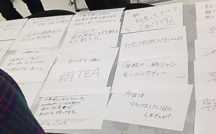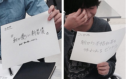 朝、紅茶という新習慣 を選択。今度はこれをもとにコピーを考えていきます。 さてその前に、アイデアの出し方をやって行きましょうと山本さん。