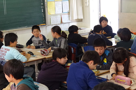 また、日光移動教室の何が思い出に残っているのかも訊ねると出てきたりします。部屋の中でバレーボールをして怒られたこととか、返ってきます。 授業自体がキャッチボールですね。 初日は何名かにキャッチコピーを発表してもらい終了。 日光移動教室が雨で二、三度流れたらしく「延期、延期、また延期」なんてコピーを考えた子もいます。さて、来週はビジュアル編です。日光にもう一度行くことはできません。さて、子どもたちはどのように工夫してくれるのか。 小道具等の持込みはOKだよ!と伝えて本日の授業を終了しました。 ■ 2月26日(木)【2日目】