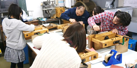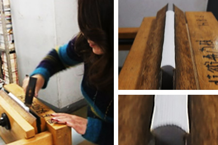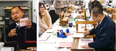 2014年度「わざラボ!第4回 製本」:「オリジナルブック型ノート制作と「製本」知識の講習と「資料館」見学と題し、板橋区の板橋本町駅にある東京製本高等技術専門学校にて開催しました。製本のプロの指導のもと、製本器具を用い手作業で上製本のブック型ノートを作り上げる実習を行いました。また、株式会社竹尾からは、用紙の提供をいただきました。