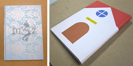 製本工業組合の井上さんのあいさつの後、常川製本の牧野さん、博勝堂渡邊さんの技を見ながら、いきなり上製本の実習がスタート。参加いただいたのは、大学生や専門学校生、現役のデザイナーなど7名。各々丸背にするか角背にするか選択し、表紙や見返しをチョイス。また、あらかじめ自分でデザインし出力してきた装丁を用いて、それぞれ世界で唯一つの上製本を作り上げました。参加者それぞれが楽しく貴重な体験ができたようです。