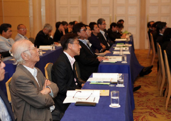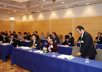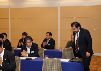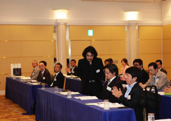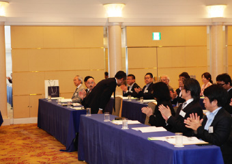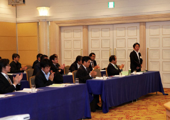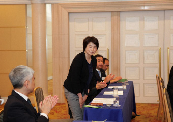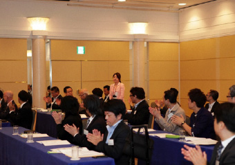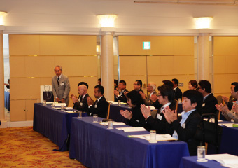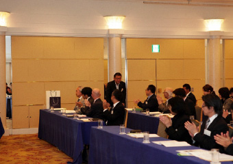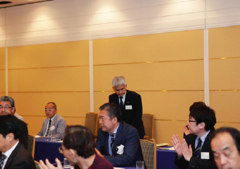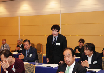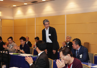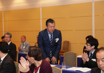 鈴木議長より湯浅氏に謝意を述べられたのち、「それでは今回の選挙結果に基づき、理事候補12名、監事候補2名の方々を、新役員として承認する旨、審議に入ります。なお、定款19条第3項の規程に基づき、候補者ごとに承認をいただきます。正会員役員候補の方は、ご紹介に伴い、その場でお立ちください。皆さまには、拍手をもってご承認いただけますようお願いいたします」