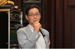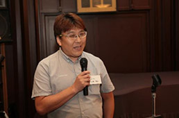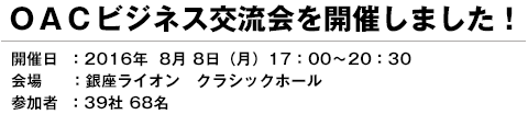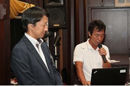 お盆休みの直前で、なにかと忙しい時期にも関わらず、数多くの会員社にご参加いただき、今年も活気溢れるビジネス交流会が始まりました。 野崎専務理事による開会の挨拶に続いては、恒例となった、テーブル毎の自己紹介タイム。 今年は少し趣向を変えて、隣合せた者同士が自己紹介をし合い、それぞれが相手のことをテーブルの全員に紹介していきます。会社の事業内容や、重点目標、個人的にはまっていることなど・・・他人のことを正しく人に伝える、というチョットした緊張感と同時に、他人に自分を紹介されるという、何となくくすぐったい状況に、テーブルのメンバー同士は一気に打解けていきました。