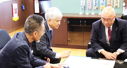平野町長を訪問。子どもたちへの支援を続けてほしい、10年経ったら復興できたことを宣言したいと平野町長。その平野町長、カレンダーを見て11月の鮭が気にいった様子。