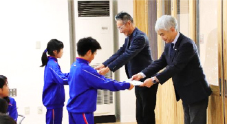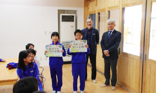 今回の訪問は、大槌学園ではキャッチコピーをつくってくれた子どもたちへの贈呈、大槌役場では平野町長に完成の報告、