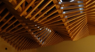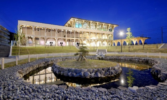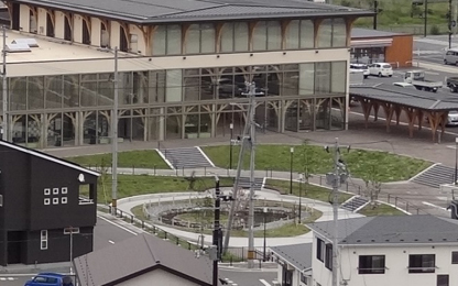 ちなみに、この施設は手を広げたような木造構造で屋根を支える。お互いが手で結び合っている、そんなデザインになっています。そこで「手をつなぎ、みんなで支える大槌町」というキーフレーズを作りました。シンボルマークも、構造をヒントに手をつないで支えている様子を表現し、手をつなぎ、支えるという二つの意味合いを持たせています。また夜も安心できるようにライトアップしています』