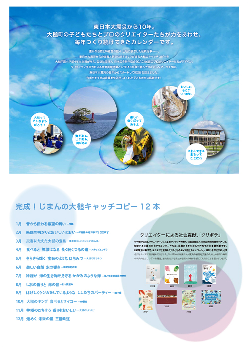 「クリボラ」とは、「クリエイティブによるボランティア」の意味。公益社団法人日本広告制作協会(OAC)に加盟する企業の広告クリエイターたちが、本業のノウハウを生かして取り組む社会貢献です。私たちOACはこの理念に基づき、ユニセフと連携した2006年の「子どものエイズ防止キャンペーン」を皮切りに、様々なテーマに取り組んできました。2012年からは、東日本大震災の被災地に向けた復興支援を目的に、岩手県大槌町へオリジナルカレンダーと義援金を届ける活動を毎年実施。伝統の祭り、美しい景観、特産品など、大槌の魅力をカレンダーに表現することで、町の皆さんには改めて郷土に誇りを感じてもらい、町外の人たちには大槌のPRツールとなることを願っています。