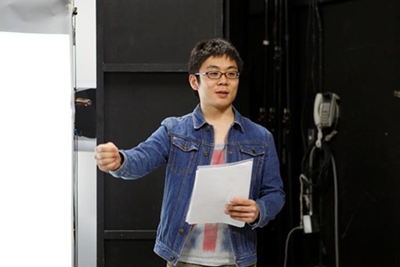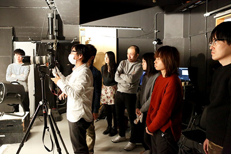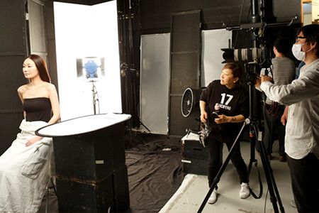 ピントは「目元」。オートフォーカスではなく寸分狂わぬ巧みのピント合わせを 行ったら「引き」で撮影が始まります。 ハイライトが気になるのでフィルターをかませてもうワンカット。これで 一気に質感が上がり表情が印象的に。 タッチペンを使って巧みに行われるレタッチ作業を、一同静かに見守っています。 ![]() さて、ポスター制作の傍ら、動画編集は同時進行です。