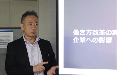 本日は特定社会保険労務士の廣本氏を講師に、昨今盛んに取り上げられている「働き方改革」についての勉強会を実施した。廣本氏は今年3月に当協会で実施した「働き方改革」アンケートも事前に読んでいただいており、アンケート内容に関する点に関しても触れていただいた。。