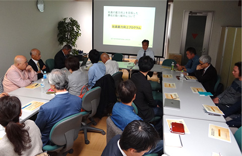 経営部会の勉強会、本日はおふたりの方に現在進行中の業務改革についてその内容、経緯、成果、苦労している点などをお話しいただき、その後、意見交換に移っていきます。まずは、セットインターナショナルグループの (株)ウィズダムパートナーズ 田實公二さんより、『社員の能力向上を目指した取り組みについて』お話しいただきました。