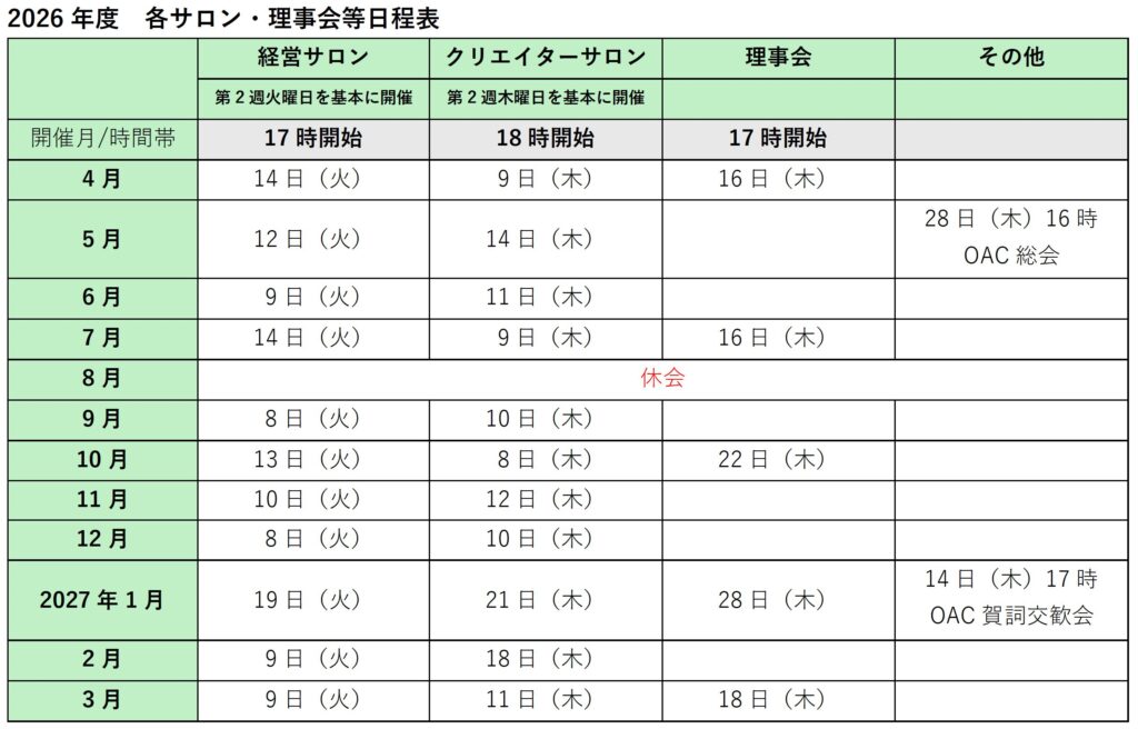 TOP インフォメーション 2026年度 OAC各サロン・理事会の開催予定表です。